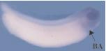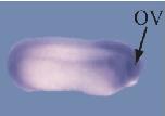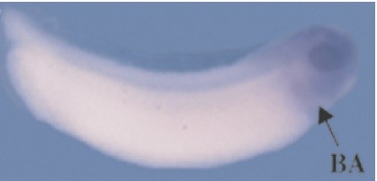 Fig. 1. Expression pattern of the Xenopus retinoblastoma gene. XRb expression was analysed by whole mount in situ hybridisation (stained in purple) in embryos at a range of stages. XRb is expressed in the anterior placodes (P) from stage 16 and increases by stage 19, especially in the optic vesicles (OV). Between stages 26 and 30, strong expression is seen in the optic vesicles, neural tube (NT) and branchial arches (BA). (A) Stage 16, anterior view; (B) stage 19, anterior view; (C) stage 26, lateral view; (D) stage 28, dorsal view; (E) stage 30, lateral view. Anteriors to the right (C, D, E).