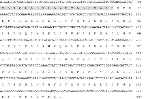 Fig. 1. Nucleic acid and the deduced amino acid sequences of zebrafish agr2. The putative signal peptide of zebrafish agr2 is shown in gray boxes. Numbers on the right indicate respective positions of nucleic acid and amino acid sequences. |