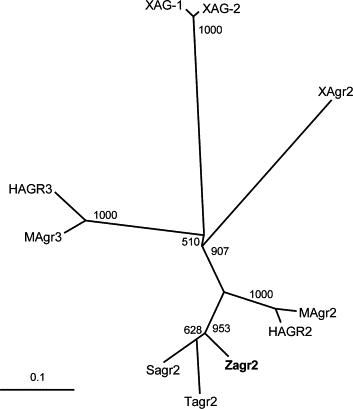 Fig. 3. Phylogenetic tree analyses of zebrafish agr2 and homologues from the pufferfish, Atlantic salmon, Xenopus, mouse, and human. A Neighbor-joining (NJ) tree is presented. The bar represents the number of estimated differences for a unit branch length. Bootstrap values are shown. Sequences used are pufferfish Tagr2 (Tetraodon nigroviridis; CAF94244); Atlantic salmon Sagr2 (Salmo salar; ABB96968); human HAGR2 (NM_006408) and HAGR3 (AY069977); mouse MAgr2 (BC013334) and MAgr3 (Q8R3W7); zebrafish Zagr2 (AY796218; this study); and Xenopus XAG-1 (U76752), XAG-2 (AF025474), and XAgr2 (AF314056). |