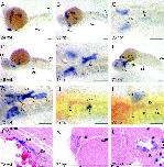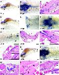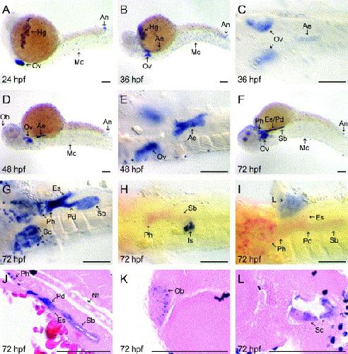 Fig. 4. Spatial mRNA expression patterns of agr2 during 24 to 72 h of development. agr2 was expressed in the otic vesicles of 24- (A), 36- (B and C), 48- (D and E), and 72-h post-fertilization (hpf) embryos (F, G). Expression of agr2 in mucous cells was observed in 24- (A), 36- (B), 48- (D), and 72-hpf embryos (F). agr2 was expressed in the hatching gland of 24- (A) and 36-hpf embryos (B). Expression of agr2 was detected in the olfactory bulbs of 48- (D) and 72-hpf embryos (K). agr2 was expressed in the anterior endoderm in 36- (B and C) and 48-hpf embryos (D and E). Expression of agr2 in the pharynx, esophagus, pneumatic duct, and swim bladder was detected in 72-hpf embryos (F and G). Images from two color double in situ hybridization using insulin (blue)/agr2 (red) (H) and LFABP (blue)/agr2 (red) (I) as probes are shown. Longitudinal paraffin sections of 72-hpf embryos revealed detailed expression of agr2 in the pharynx, pneumatic duct, esophagus, swim bladder (J), olfactory bulb (K), and semicircular canal of the inner ear (L). No expression of agr2 can be found in the notochord of 72-hpf embryos (J). All embryos are shown with the anterior to the left. Embryos in A, B, D, and F are shown in lateral view, while embryos in C, E, G, H, and I are shown in ventral view. Ae, anterior endoderm; an, anus; es, esophagus; hg, hatching gland; nt, notochord; ob, olfactory bulb; ov, otic vesicle; pd, pneumatic duct; ph, pharynx; sb, swim bladder; sc, semicircular canal. Bars represent 100 μm. |