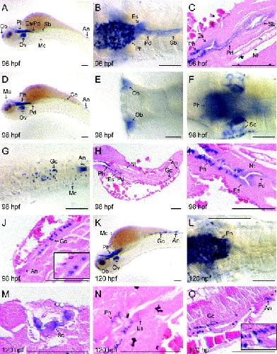 Fig. 5. Spatial mRNA expression patterns of agr2 during 96–120 h of development. agr2 was expressed in the otic vesicles of 96- (A), 98- (D, F), and 120-h post-fertilization (hpf) embryos (K, M). Expression of agr2 in mucous cells and anus was observed in 96- (A), 98- (D), and 120-hpf embryos (K). Expression of agr2 was detected in the olfactory bulbs of 96- (A), 98- embryos (E), and 120-hpf embryos (K). Expression of agr2 in the pharynx was observed from 96 to 120 h of development (A–D, F, H, I, K, L, and N). Expression of agr2 in the esophagus, and pneumatic duct was detected in 96-h (B and C) and 98- hpf embryos (D, H, and I). Expression of agr2 in the swim bladder can only be detected in 96-hpf embryos (B and C). Trace amount of agr2 expression in the esophagus can be observed in paraffin sections of 120-hpf embryos (N). agr2 was expressed in the goblet cells located in the mid-intestine region of 98- (D, G, H, and J) and 120-hpf embryos (K and O). Higher magnification view of agr2-expressing goblet cells was shown as insets in J and O, respectively. No expression of agr2 can be observed in the notochord of 96- (C) and 98-hpf embryos (H and I). Longitudinal paraffin sections of 96- (C), 98- (H–J), and 120-hpf embryos (M–O) revealed agr2 expression in the pharynx, esophagus, pneumatic duct, swim bladder, goblet cells, semicircular canal, and anus. All embryos are shown with the anterior to the left. Embryos in A, D, and K are shown in lateral view, embryos in B, G, and L are shown in ventral view, and embryos in E and F are shown in their dorsal view. Ae, anterior endoderm; an, anus; es, esophagus; hg, hatching gland; nt, notochord; ob, olfactory bulb; ov, otic vesicle; pd, pneumatic duct; ph, pharynx; sb, swim bladder; sc, semicircular canal. Bars represent 100 μm. |
