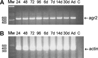 Fig. 6. Temporal expression pattern of agr2 during different developmental stages analyzed by RT-PCR. DNase I-treated total RNA isolated from 24-, 48-, 72-, and 96-h post-fertilization, 6-, 7-, 14-, 30-day post-fertilization, and adult fish (Ad) was used to conduct RT reaction. (A) An agr2-specific primer pair was used in PCR and resultant 510 bp PCR product was analyzed. (B) An α-actin-specific primer pair was used in PCR and amplified 350 bp DNA fragments were examined by agarose electrophoresis. No template controls (C) in respective PCRs were shown. |