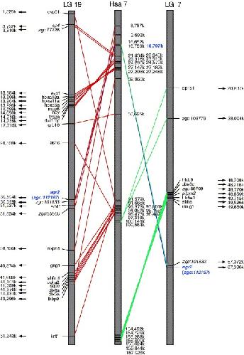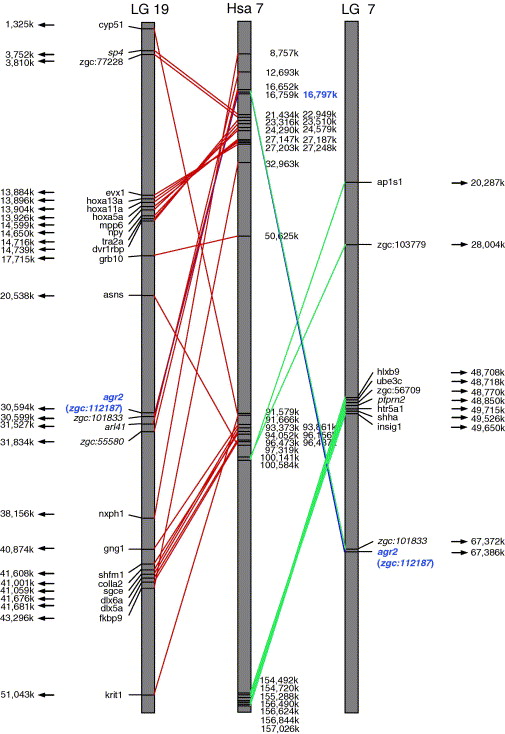 Fig. 8. Maps showing gene order with conserved syntenic groups between human chromosome 7 and respective zebrafish linkage group 7 and 19. Genes sharing equal or greater than 60% amino acid sequence identity and their start positions (million base pair) on respective zebrafish linkage group 7 (LG 7), 19 (LG 19), and human chromosome 7 (Hsa 7) are shown. The entire chromosome (grey box) is shown, but the scale is different in different chromosomes. Names of the zebrafish external gene ID are shown next to both zebrafish linkage group 7 and 19. Some zebrafish external gene IDs are italicized and they represent genes showing syntenic conservation with those in mouse chromosome 12 where Agr2 lies. |