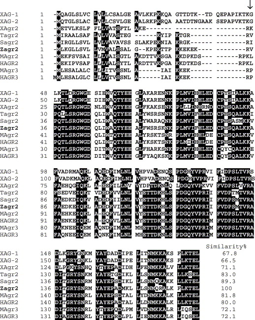 Fig. 2. Alignment of the amino acid sequence of zebrafish agr2 with other anterior gradient 2 homologues from the pufferfish, Atlantic salmon, Xenopus, human, and mouse. Identical amino acid sequences which are greater than or equal to seven are shown in black boxes. Gaps are introduced as represented by dots to optimize the alignment. An arrow indicates the residue used as the first N-terminal amino acid for phylogenetic analyses. The percentage of amino acid similarity between zebrafish agr2 and each homolog from other vertebrate organisms is shown. Sequences are pufferfish Tagr2 (Tetraodon nigroviridis; CAF94244); Atlantic salmon Sagr2 (Salmo salar; ABB96968); human HAGR2 (NM_006408) and HAGR3 (AY069977); mouse MAgr2 (BC013334) and MAgr3 (Q8R3W7); zebrafish Zagr2 (AY796218; this study); and Xenopus XAG-1 (U76752), XAG-2 (AF025474), and XAgr2 (AF314056). |