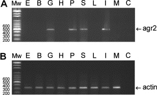 Fig. 7. Distribution of agr2 in different tissues or organs isolated from adult fish. DNase I-treated total RNA isolated from the eye (E), brain (B), gill (G), heart (H), pharynx/esophagus (P), swim bladder/pneumatic duct (S), liver (L), intestine (I), and muscle (M) was used to perform RT reaction. An agr2-specific primer pair was used in PCR and 510 bp amplified DNA fragments were analyzed and shown in A. An α-actin-specific primer pair was used in PCR and amplified 350 bp DNA fragments were examined and shown in B. No template controls (C) in respective PCRs were shown. |