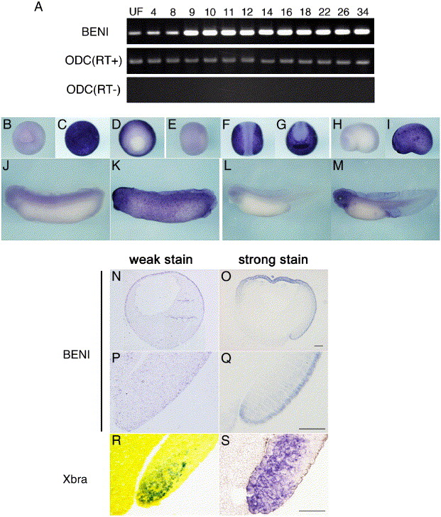 Fig. 2. Temporal and spatial expression pattern of BENI during Xenopus development. (A) Temporal expression pattern of BENI during Xenopus development detected by RT-PCR. RT-PCR using an ornithine decarboxylase (ODC)-specific primer was carried out in parallel to control the amount of input RNA [ODC]. RT-PCR without reverse transcriptase showed no contamination of genomic DNA [ODC(RTâ)]. (BâQ) Spatial expression pattern of BENI during development detected by whole-mount in situ hybridization. Embryos were hybridized with antisense (C, D, F, G, I, K, MâP, Q) and sense probes (B, E, H, J, L). (B, C) Stage 11, animal view. (D) Stage 11, vegetal view. (E, F) Stage 17, lateral view. (G) Stage 17, anterior view. (H, I) Stage 22, lateral view. (J, K) Stage 29/30, lateral view. (L, M) Stage 40, lateral view. (NâS) Transverse section of the embryo at stage 10.5. Panels P and Q are magnified views of panels N and O, respectively. Xbra expression (RâS). Scale bars, 100 μm.