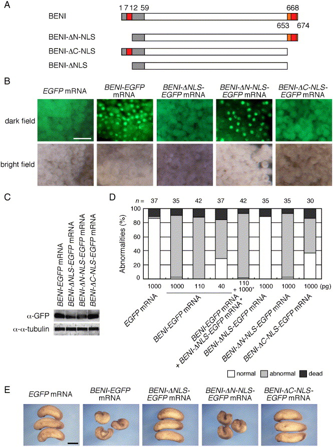 Fig. 6. The C-terminal NLS is predominant in the subcellular localization of BENI. (A) Schematic structure of BENI and its derivatives lacking the N-terminal NLS (N-NLS) including a Pat-4 signal (red) in the conserved region (gray), and C-terminal NLS regions (C-NLS) including a Pat-4 and bipartite signal (yellow). (B) The subcellular localization of BENI and its derivatives. BENI-EGFP and its NLS deletion mutants mRNA (330 ng) or EGFP mRNA as control was injected in the animal pole of Xenopus embryos. The embryos were raised until stage 9 and the EGFP was visualized and observed under a fluorescent microscope. Scale bar, 100 μm. (C) Expression of BENI and its derivatives. Animal caps harvested from panel B were lysed and subjected to SDS-PAGE for immunoblotting with anti-GFP and anti-α-tubulin. (D, E) Injection of BENI-EGFP and its NLS deletion mutants mRNA at both dorsal animal blastomeres of 4-cell embryos. The embryos were observed at stage 24. Scale bar, 1 mm.