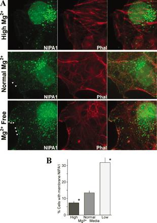 Subcellular redistribution of NIPA1 in response to magnesium. COS7 cells were cultured in high magnesium, 5.0 mm, normal magnesium, 0.8 mm, or low magnesium, nominally magnesium-free, for 12 h. A, immunofluorescence was performed with NIPA1 antibody and the surface marker, phalloidin. The merged images of labeled cells are also shown in the far right panel. B, summary of NIPA1 accumulation at the peripheral membrane in response to changes in magnesium.
