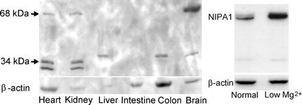 Tissue distribution of endogenous mouse NIPA1 protein expression. Left, Western blotting of endogenous NIPA1 protein in various mouse tissues. An aliquot of protein (50 μg) from the indicated mouse tissues was applied to each lane and labbeled with a specific polyclonal antibody for NIPA1. The gel is representative of three separate tissue preparations. Right, NIPA1 protein increases in epithelial cells cultured in low magnesium media. Shown is a representative blot, one of seven performed on different cell preparations. The mean band density increased 163 ± 7% with low magnesium relative to those cultured with normal concentrations of magnesium.