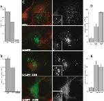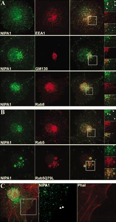 Subcellular localization of endogenous NIPA1. Immunofluorescence staining of COS7 cells is shown. A, cells were fixed and incubated with NIPA1 antibody and the early endosome markers, EEA1 (A, top panel), or the Golgi marker, GM130 (A, center panel), or the TGN-recycling endosome marker, Rab8 (A, bottom panel). B, Rab5 (B, top panel) or Rab5Q79L (B, bottom panel) were used to confirm endosomal localization. C, COS7 cells were stained with phaloidin to delineate the cell surface. Overlays are shown in the third column of each figure with enlarged close-ups in the far right column. The arrows indicate co-localization of NIPA1 protein with the respective marker. Similar subcellular distributions were found in MDCT, HEK293, and primary hippocampal brain cells.