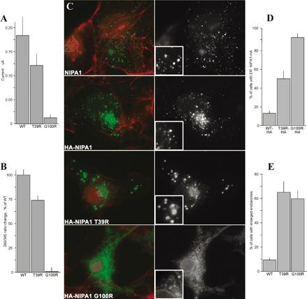 Loss-of-function mutations in NIPA1. A, summary of Mg2+-evoked currents in NIPA1T39R- and NIPA1G100R-expressing oocytes compared with wild-type NIPA1-expressing oocytes. Currents were measured with 2.0 mm MgCl2 at a holding voltage of 100 mV according to the methods given in the legend to Fig. 2, left. Results are mean ± S.E. for n = 7, 10, and 7 oocytes, respectively. B, Mg2+ flux, determined by mag-fura-2 fluorescence, into NIPA1T39R- and NIPA1G100R-expressing oocytes. Mg2+ concentration was measured with 2.0 mm MgCl2 according to the methods given in the legend to Fig. 2, right. Results are means of four oocytes. C, immunofluorescence images of NIPA1-HA-, NIPA1T39R-HA-, or NIPA1G100R-HA-expressing COS7 cells. D, summary of NIPA1T39R-HA and NIPA1T100R-HA retention in the endoplasmic reticulum (ER) relative to the wild-type NIPA1 protein. E, increase in endosomal size of NIPA1T39R-HA and NIPA1T100R-HA transfected relative to the wild-type NIPA1-HA-transfected COS7 cells. WT, wild type.