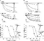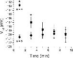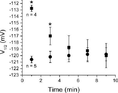 Figure 5. Phosphatase inhibitors delay the rundown in V1/2. V1/2 values were assessed after inside-out patches were excised into normal bath solution (circles) or FV bath solution to inhibit phosphatase activity (squares). The differences in respective V1/2 values measured 1 and 3 min after patch excision were statistically significant (*, P < 0.05, t test). |