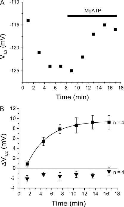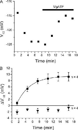 Figure 6. Application of MgATP to inside-out patches shifts HCN2 activation to more positive voltages. (A) Time course of V1/2 of HCN2 in a single inside-out patch experiment showing rundown and response to MgATP. Experiment performed in FV solution to inhibit endogenous phosphatase activity. (B) Time course of average V1/2 shift after bath application of MgATP in absence (squares) or presence (inverted triangles) of 15 μM wortmannin to block PI kinases. For data in response to MgATP alone, the single exponential fit yielded values for the steady-state shift in V1/2 of +9.5 mV and a t1/2 of 3.8 min. |