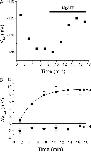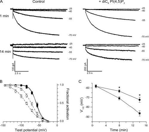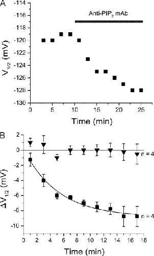 Figure 7. Reducing endogenous PI(4,5)P2 levels shifts HCN2 activation to more negative voltages. (A) Time course of V1/2 in a single inside-out patch experiment in response to bath application of 30.3 μg/ml of anti-PI(4,5)P2 antibody. (B) Time course of average V1/2 shifts after bath application of anti-PI(4,5)P2 antibody (squares) or heat-inactivated antibody (inverted triangles). |