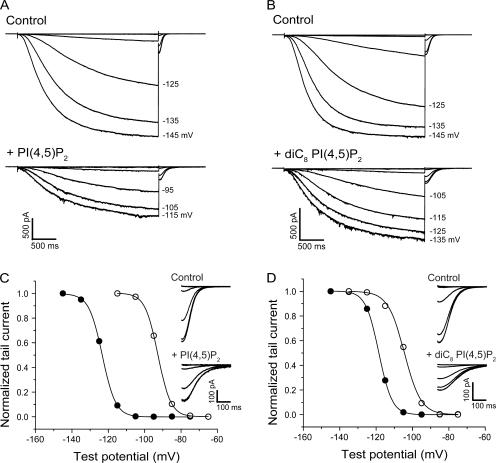 Figure 1. Phosphatidylinositol 4,5-bisphosphate (PI(4,5)P2) and dioctanoyl phosphatidylinositol 4,5-bisphosphate (diC8 PI(4,5)P2) cause depolarizing shifts in the activation of HCN2. Macroscopic HCN2 currents are shown for individual inside-out patches in response to a series of hyperpolarizing voltage steps. (A) Before (top) and after (bottom) a 15′ bath application of 1 μM native PI(4,5)P2. (B) Before (top) and after (bottom) a 10′ bath application of 25 μM diC8 PI(4,5)P2. (C and D) Normalized tail currents from A and B, respectively, plotted as a function of test potential and fit with the Boltzmann equation. Data obtained in absence (filled circles) or presence (open circles) of PI(4,5)P2 and diC8 PI(4,5)P2 application. Insets show expanded records of tail currents from A and B, measured at −40 mV. |