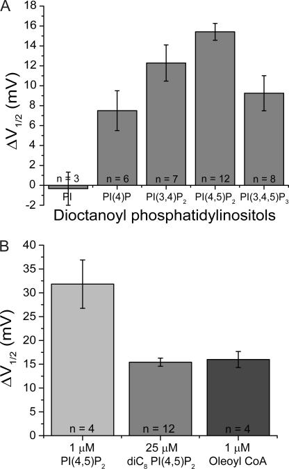 Figure 3. Shift in V1/2 of HCN2 depends on number and location of inositol phosphates and on acyl chain length. (A) V1/2 shifts with 10-min applications of dioctanoyl phosphatidylinositol (PI) (−0.3 ± 1.7 mV, n = 3), dioctanoyl phosphatidylinositol 4-phosphate (PI(4)P) (+7.5 ± 2.0 mV, n = 6), dioctanoyl phosphatidylinositol 3,4-bisphosphate (PI(3,4)P2) (+12.3 ± 1.8 mV, n = 7), dioctanoyl phosphatidylinositol 4,5-bisphosphate (PI(4,5)P2), and dioctanoyl phosphatidylinositol 3,4,5-trisphosphate (PI(3,4,5)P3) (+9.3 ± 1.8 mV, n = 8). Differences between the responses to diC8 PI(4,5)P2 and diC8 PI(3,4,5)P3 and between the responses to diC8 PI(4,5)P2 and diC8 PI(4)P are statistically significant (P < 0.05; ANOVA, Post Hoc). (B) V1/2 shifts after 28-min application of 1 μM of native PI(4,5)P2 (+31.8 ± 5.1 mV, n = 4), 10-min application of 25 μM diC8 PI(4,5)P2 (+15.4 ± 0.8 mV, n = 12), and 2-min application of 1 μM oleoyl coA (+16.0 ± 1.7 mV, n = 4). |
