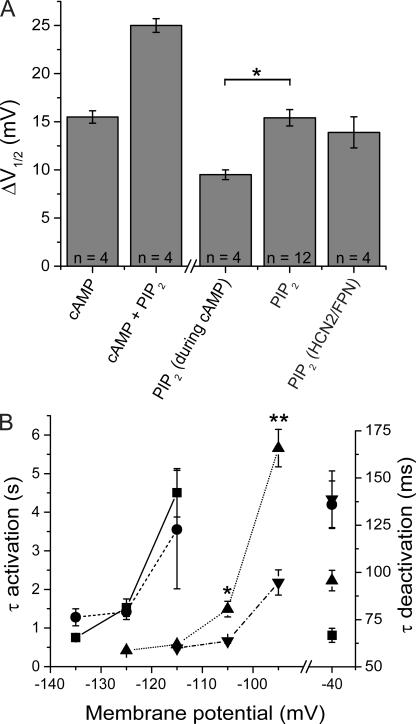 Figure 4. Effects of cAMP and diC8 PI(4,5)P2 on V1/2 and channel kinetics are not independent. (A) Interaction of effects of cAMP and diC8 PI(4,5)P2 on V1/2. Bars show the following (from left to right): cAMP, shift in V1/2 in response to 10 μM cAMP; cAMP + PIP2, shift in V1/2 in response to 10 μM cAMP plus 25 μM diC8 PI(4,5)P2; PIP2 (during cAMP), the difference between the shift in V1/2 in response to cAMP plus diC8 PI(4,5)P2 and the shift produced by cAMP alone; PIP2, shift in response to 25 μM diC8 PI(4,5)P2 alone; PIP2 (HCN2/FPN), shift of mutant channel in response to 25 μM diC8 PI(4,5)P2. The shift with diC8 PI(4,5)P2 in the presence of cAMP is less than the shift with diC8 PI(4,5)P2 alone (PIP2) (*, P < 0.01, t test). Error bars show SEM. Number of experiments shown in each bar. (B) Interaction of effects of cAMP and diC8 PI(4,5)P2 on time constants (τ) of HCN2 activation (left axis) and deactivation (right axis). Squares, data obtained in absence of PIP2 and cAMP (solid line, n = 14); circles, data obtained in the presence of 25 μM diC8 PI(4,5)P2 (dashed line, n = 10); triangles, data obtained in presence of 10 μM cAMP (dotted line, n = 4); inverted triangles, data obtained in combined presence of 10 μM cAMP plus 25 μM diC8 PI(4,5)P2 (dash dotted line, n = 4). The difference between the time constant of activation at −105 mV in the presence of cAMP (1.49 ± 0.20 s) versus that in the presence of cAMP and PIP2 (0.664 ± 0.056 s) was statistically significant (*, P < 0.02, t test). The difference between the time constant of activation at −95 mV in the presence of cAMP (5.66 ± 0.48 s) and in the presence of cAMP and PIP2 (2.18 ± 0.33 s) was also statistically significant (**, P < 0.001, t test). |