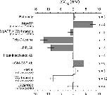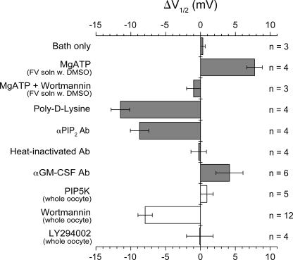 Figure 8. Summary of effects of altering PI(4,5)P2 levels on HCN2 gating. Average shifts in V1/2 shown in response to various agents using either inside-out patches (gray bars) or whole oocytes (open bars). From top to bottom: bath only (no treatment); 2 mM MgATP (in FV solution, 0.05% DMSO); 2 mM MgATP plus 15 μM wortmannin (in FV solution, 0.05% DMSO); 25 μg/ml poly-d-lysine; 30.3 μg/ml anti-PI(4,5)P2 antibody (αPIP2 Ab); 30.3 μg/ml heat-inactivated anti-PI(4,5)P2 antibody; 30.3 μg/ml anti-granulocyte macrophage colony stimulating factor antibody (αGM-CSF Ab); V1/2 of HCN2 coexpressed with PI(4)P 5-kinase minus V1/2 of HCN2 expressed alone (PIP5K); V1/2 of HCN2 after 30–40-min preincubation in 15 μM wortmannin and 0.05% DMSO minus V1/2 after preincubation in 0.05% DMSO alone (Wortmannin); V1/2 after 2-h preincubation in 20 μM LY294002 and 0.1% DMSO minus V1/2 after preincubation in 0.1% DMSO alone (LY294002). Error bars show SEM. Number of experiments shown next to each bar (n). |