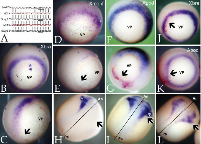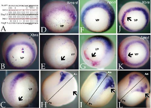 Figure 1. Slug morpholino effects:Panel A is a comparison of the Slug morpholino sequence (“MO”) with X. laevis SlugA, SlugB, and Snail RNA sequences; start codons are underlined. B–G: Injection of the Slug MO (10 ng/embryo) blocks the expression of Xbra (B-uninjected, C-Slug MO injected), Xmenf (D-uninjected, E-injected), and Antipodean (Apod)(F-uninjected, G-injected). Arrows (C,E,G) point to region of suppression; vegetal pole (“VP”) is indicated. In G, the red staining is due to a β-galactosidase lineage marker. H: Injection of the Slug MO into one cell of a two cell embryo blocks the expression of Sox9 on the injected side (arrow); “*” marks otic placode domain of Sox9 expression. I: Sox9 expression in Slug MO injected embryos is rescued by co-injection of mycGFP-Slug RNA (650 pg/embryo). In analogous studies, the effects of the Slug MO (10 ng/embryo) on Xbra (J), Apod (K) and Sox9 (L) expression were rescued by injection of Snail RNA (500 pg/embryo). In H, I and L, the line marks midline of the embryo, with anterior (“An”) and posterior (“Ps”) indicated. |