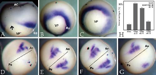 Figure 2. Timing of Slug rescue of Slug MO phenotypes:To analyze the timing of Slug activity in the early embryo, we injected one cell of two cell embryos with Slug MO (10 ng/embryo) together with RNA (650 pg/embryo) encoding the chimeric GR-Slug-GFP protein. A: In the absence of the activating drug dexamethasone, the Slug MO phenotype, i.e. suppression of Xbra expression in stage 11 embryos (A)(arrow) and suppression of Sox9 expression in stage 16 embryos (D), was unaltered. When embryos were treated with dexamethasone (20 µM) beginning at stage 8, there as an essentially complete rescue of Xbra (B,C) and Sox9 expression (E,H). Treatment of embryos with dexamethasone at stage 11 (early gastrulation) was also effective at rescuing Sox9 expression (F,H), while addition of dexamethasone at stage 13 (late gastrulation/early neurulation) produced at most a partial and inefficient rescue of Sox9 expression (G,H). |