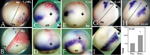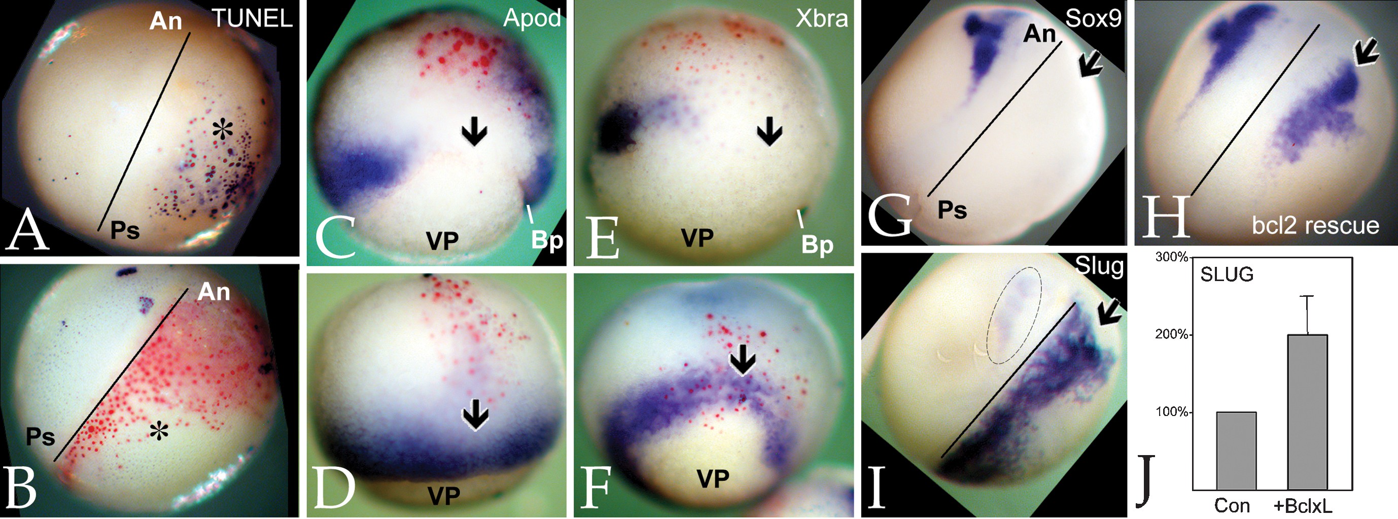 Figure 3. Rescue of Slug MO effects by Bcl-xLA: Injection of the Slug MO leads to an increase in TUNEL staining. B: This increase is blocked by the injection of Bcl-xL RNA (600 pg/embryo and co-injected with LacZ RNA). Injected sides of embryos are marked by an “*” and red staining; line marks midline of the embryo, with anterior (“An”) and posterior (“Ps”) indicated. Injection of Bcl-xL RNA (600 pg/embryo) rescues Apod (C- Slug MO injected, D-Slug MO+Bcl-xl RNA injected), Xbra (Ε- Slug MO injected, F-Slug MO+Bcl-xl RNA injected), and Sox9 expression (G- Slug MO injected, H-Slug MO+Bcl-xL RNA injected). I: Injection of Bcl-xL RNA into one cell of a two-cell embryo led to a dramatic increase in the intensity and extent of Slug expression at stage 16; the region of Slug expression on the uninjected (control) side of the embryo is indicated by the dashed circle. J: Injection of Bcl-xL RNA produced an increase in Slug RNA levels in animal caps prepared at stage 8/9 and analyzed by QRT-PCR when uninjected embryos reached stage 11. Ornithine decarboxylase (ODC) was used as normalization control. RNA levels in the control case were set to 100%. |