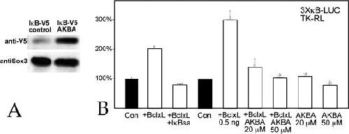 Figure 4. Characterization of Bcl-xL effects on NF-κB activity.A: Fertilized eggs were injected with RNA (650 pg/embryo) encoding Xenopus IκBα-V5. Beginning at stage 8, experimental embryos were treated with 50 µM AKBA and analyzed at stage 11 by SDS-PAGE/immunoblot using an anti-V5 antibody and the antiSOX3c antibody to visualize endogenous Sox3 protein as a loading control. AKBA treatment stabilized the IκBα-V5 polypeptide. B: Fertilized eggs were injected with p3XκB-firefly luciferase (“3κB-Luc”) and pTK-Renilla luciferase (“RL-TK”) DNAs (10 pg/embryo each) either alone (“Con”) or together with Bcl-xL (500 pg/embryo) RNA, or Bcl-xL and IκBsa (600 pg/embryo) RNAs. Alternatively, animal caps prepared from Bcl-xL RNA injected embryos were cultured in either control buffer (0.1% DMSO), 20 µM or 50 µM AKBA. At stage 11, caps were analyzed for luciferase activity. Bcl-xL induced an increase in 3XκB-Luc activity that was blocked by either IκBsa or AKBA. Error bars in B reflect standard deviation from the mean of multiple experiments. |