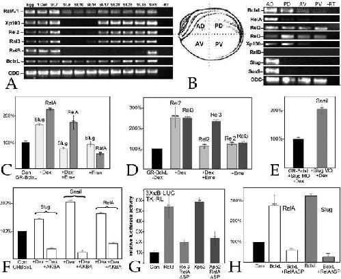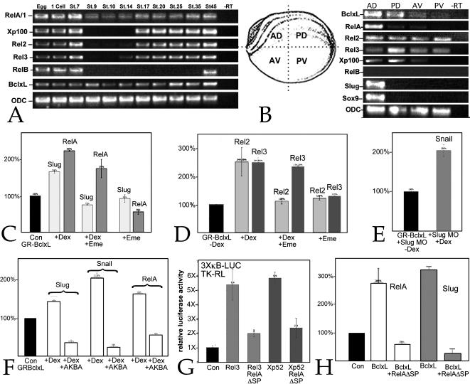 Figure 5. Bcl-xL regulation of NF-κB RNAs:A: RNA was extracted from eggs and embryos at various stages and analyzed by RT-PCR (28 cycles); levels of RelA, Rel2, Rel3, RelB and Xp100 RNAs drop between stage 7 and 9 and, except for RelB, increase following gastrulation (stage 12/13). Levels of Bcl-xL RNA appear relatively constant throughout this period of development. B: At stage 16, embryos were dissected into anterior dorsal (AD), posterior dorsal (PD), anterior ventral (AV), and posterior ventral (PV) quadrants and RNA was analyzed by RT-PCR; RelB was not expressed at this stage; expression of RelA, Slug and Sox9 are restricted to the anterior dorsal quadrant, while Bcl-xL, Rel2, Rel3, and Xp100 RNAs can be detected throughout the embryo. C, D: Animal caps were prepared from embryos injected with GR-Bcl-xL-GFP RNA (“GRBclxL”)(600 pg/embryo) and either left untreated (0.1%DMSO)(“Con”), treated with 20 µM dexamethasone (“+Dex”), treated first with 100 µg/ml emetine and then dexamethasone (“+Dex+Eme”), or treated with emetine alone (“+Eme”), and analyzed at stage 11 for Slug, RelA (C), Rel2 and Rel3 (D) RNA levels. Treatment with emetine blocked the increase in Slug and Rel2, but not RelA and Rel3 RNAs; emetine treatment alone produced control or slightly reduced levels of Slug and Rel RNAs. E: Activation of the GR-Bcl-xL-GFP protein in embryos injected with the Slug MO produces an increase in the level of Snail RNA, analyzed at stage 11. F: In animal caps derived from GR-BclxL-GFP RNA injected embryos, AKBA (50 µM) inhibited the dexamethasone-induced increases in Slug, Snail, and RelA RNA levels; while treatment with AKBA alone lead to a decrease in Slug, Snail and RelA RNA levels. G: In animal caps, injection of RelAΔSP RNA (600 pg/embryo) blocked Rel3 and Xp52 RNA induced activation of the 3XκB reporter. H: The ability of Bcl-xL RNA to increase levels of RelA and Slug RNAs in animal caps was blocked by the co-injection of RelAΔSP RNA. Error bars in C–H reflect standard deviation from the mean of multiple experiments. |