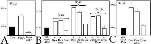 Figure 7. NF-κB's regulatory targets:A: In animal caps, RelA lead to an increase in Slug RNA levels, while RelAΔSP produced a decrease. When activated by dexamethasone (+Dex), the hormone-regulated form of RelA, GR-RelA (600 pg RNA/embryo), induced a similar increase in the levels of Slug RNA, as well as Snail, Sox9 (B), and Bcl-xL (C) RNAs compared to animal caps from GR-RelA injected embryos not exposed to dexamethasone. Similar effects were seen in the presence of emetine (+Dex+Eme,), while emetine alone (+Eme) had little effect on any of measured RNA levels. Error bars in reflect standard deviation from the mean of multiple experiments. |