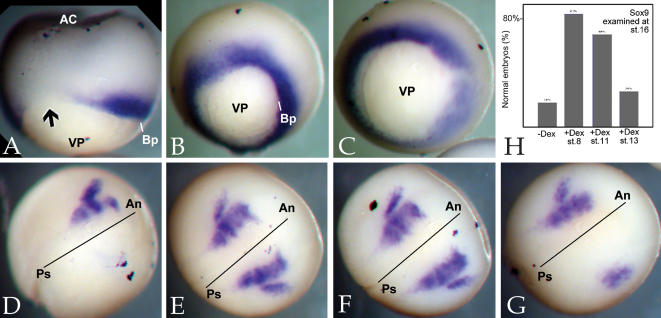 figure 2. Timing of Slug rescue of Slug MO phenotypes: To analyze the timing of Slug activity in the early embryo, we injected one cell of two cell embryos with Slug MO (10 ng/embryo) together with RNA (650 pg/embryo) encoding the chimeric GR-Slug-GFP protein. A: In the absence of the activating drug dexamethasone, the Slug MO phenotype, i.e. suppression of Xbra expression in stage 11 embryos (A)(arrow) and suppression of Sox9 expression in stage 16 embryos (D), was unaltered. When embryos were treated with dexamethasone (20 µM) beginning at stage 8, there as an essentially complete rescue of Xbra (B,C) and Sox9 expression (E,H). Treatment of embryos with dexamethasone at stage 11 (early gastrulation) was also effective at rescuing Sox9 expression (F,H), while addition of dexamethasone at stage 13 (late gastrulation/early neurulation) produced at most a partial and inefficient rescue of Sox9 expression (G,H). |