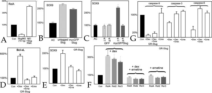 Figure 8. Slug's regulatory targets:A: In animal caps analyzed at stage 11, the Slug MO (10 ng/embryo) produced a decrease in RelA RNA levels that was rescued by co-injection of mycGFP-Slug RNA (1 ng/embryo). B: Animal caps were prepared from embryos injected with either untagged or mycGFP-Slug RNAs; both produced a similar increase in Sox9 RNA levels. C: Animal caps, from embryos injected with either mt-GFP or mycGFP-Slug RNAs, were analyzed when control embryos reached stage 11 or stage 16; at stage 11 mycGFP-Slug induced an increase in Sox9 RNA levels, which returned to baseline by stage 16. No change in Sox9 RNA levels were observed at either stage in animal caps expressing mt-GFP. In GR-Slug injected caps, levels of Bcl-xL (D), Sox9 (E), RelA, Rel2 and Rel3 (F), and caspase-9, -3 and -6 (G) RNAs were increased in response to dexamethasone; with the sole exception of caspase-9, these increases were blocked by emetine. In all panels, error bars reflect standard deviation from the mean of multiple experiments. |