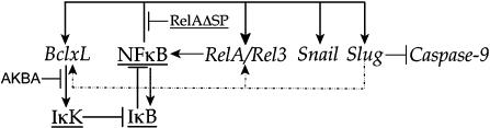 Figure 9. Bcl-xL-Slug-NF-κB network:This diagram focuses on the regulatory interactions uncovered in the course of our studies (see text for caveats associated with the identification of direct interactions). Protein names are underlined, gene names are in italics. Bcl-xL appears to activate NF-κB through effects on IκK activity and IκB stability. NF-κB acts directly to regulate Slug, Snail, RelA, and Rel3 levels; NF-κB regulation of the expression of its inhibitor IκB is based on data from mammalian systems. Caspase-9 was the only direct target of Slug identified in our studies; indirect interactions are indicated by dotted lines. |