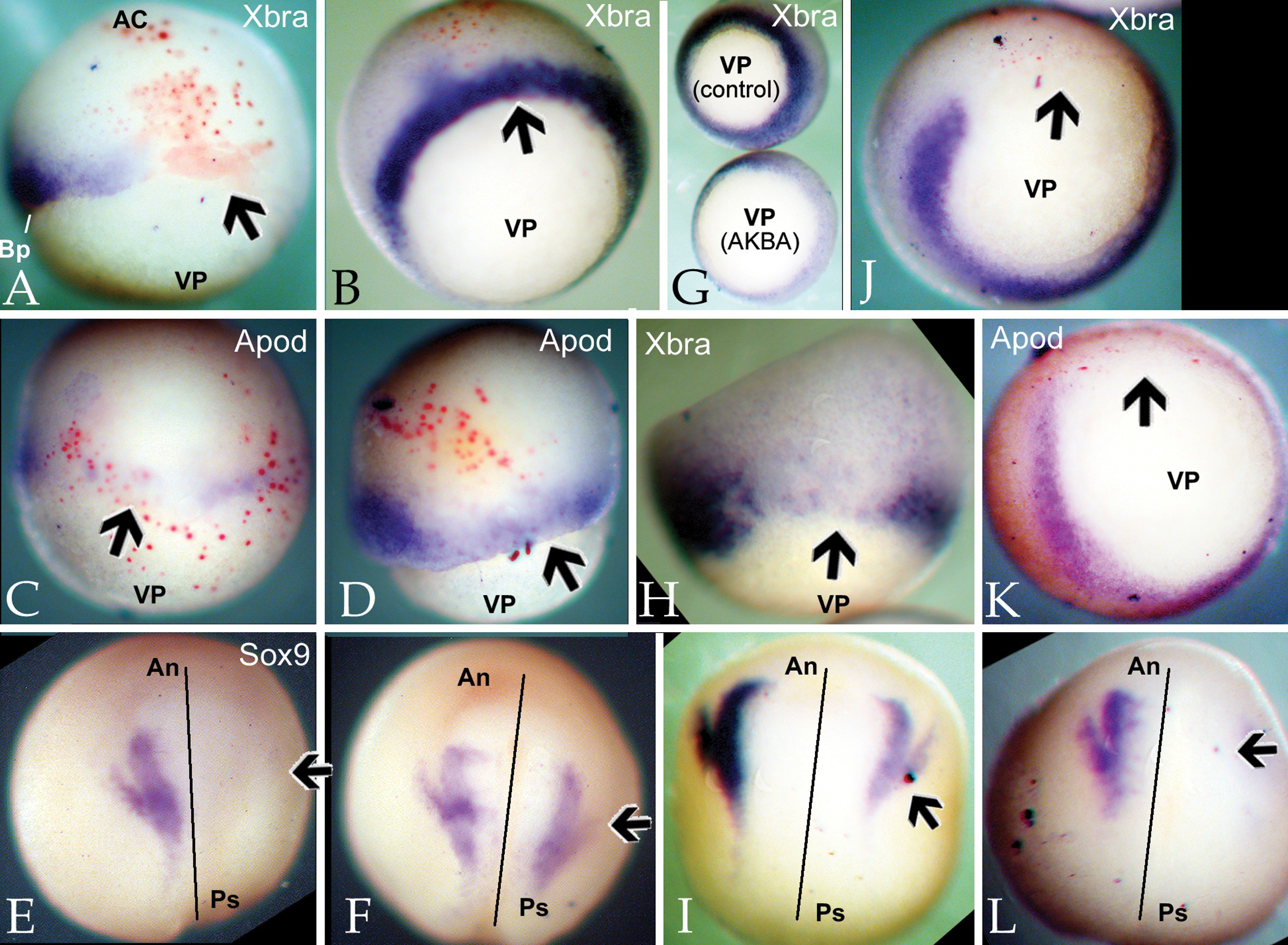Figure 6. NF-κB regulation of mesodermal and neural markers: The Slug MO induced loss of Xbra (A,B), Apod (C,D) and Sox9 (E,F) expression was rescued by injection of RelA RNA (600 pg/embryo)(A, C, E-Slug MO alone, B, D, F-Slug MO+RelA RNA). G: Treatment of early embryos with AKBA (50 µM from the 4-cell stage on) lead to a decrease in Xbra staining (control and AKBA-treated embryos marked). Injection of RNA encoding IκBsa (H,I) or RelAδSP (JâL) had effects similar to that seen in Slug MO injected embryos; that is, both induced the reduction of Xbra (H,J), Apod (K) and Sox9 (I,L) RNA staining. AKBA treatment had no reproducible effect on Sox9 expression (data not shown). Arrows mark affected regions. |