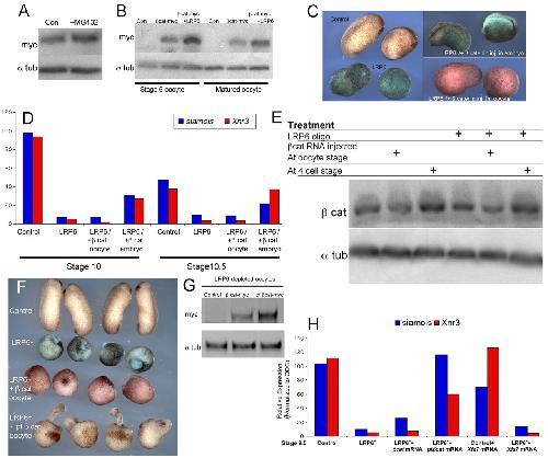 Fig. 7. Exogenous β-catenin is degraded in oocytes. (A) Western blot of wild-type unmatured oocytes injected with 100 pg myc-taggedβ -catenin mRNA (Con) and oocytes injected with 100 pg myc-taggedβ -catenin mRNA and treated with the proteasome inhibitor MG132 (+MG132), frozen after 3 days in culture and probed with an anti-myc antibody. Myc-tagged β-catenin protein expression was enhanced in the presence of the proteasome inhibitor (44% increase compared with control levels), suggesting that β-catenin is degraded by a proteasomal pathway. (B) Western blot of wild-type oocytes injected with 100 pg myc-taggedβ -catenin mRNA (βcat-myc) compared to oocytes co-injected with 100 pg myc-tagged β-catenin mRNA together with 400 pg LRP6 mRNA (βcat-myc +LRP6) frozen after 3 days in culture and probed with an anti-myc antibody. One group of oocytes was matured for 8 hours after progesterone stimulation (Matured oocyte) before freezing. Myc-taggedβ -catenin protein expression was enhanced in the presence of LRP6, both before (increased by 32%) and after (increased by 62%) maturation. (C) The ventralized phenotype of LRP6-depleted embryos (bottom left; 6/7 ventralized) was rescued by 50 pg β-catenin mRNA when injected at the 4-cell stage (top right; 0/15 ventralized), but not by injection of 50 pg β-catenin mRNA in the stage-6 oocyte before maturation (bottom right; 7/7 ventralized; 16 died at cleavage stage). (D) The expression of the Wnt target genes siamois and Xnr3 assayed by real-time RT-PCR at the beginning and early gastrula stages (stage 10 and 10.5) in embryos that were siblings to those shown in C. Expression of Wnt target genes was severely reduced in LRP6-depleted embryos, and were partially rescued by the injection of β-catenin mRNA after, but not before, fertilization. (E) Western blot of sibling embryos to those shown in C, frozen at the 64-cell stage and analyzed for total β-catenin protein. Injection of LRP6 oligo reduced β-catenin levels, which was rescued by the injection of β-catenin mRNA at the 4-cell stage, but not by injection of β-catenin mRNA in the oocyte. (F) Stabilized β-catenin mRNA (ptβcat-myc, 20 pg) rescued LRP6 depletion when injected into oocytes (8/12 cases dorsalized), in comparison to 20 pg wild-type β-catenin mRNA (8/8 ventralized). Embryos at tailbud stage. (G) Western blot of lysates of LRP6-depleted oocytes that were siblings to those used in F. Protected β-catenin protein accumulates after 48 hours in culture, more so than wild type β-catenin. (H) The expression of the Wnt target genes siamois and Xnr3, assayed by real-time RT-PCR at stage 9.5 in sibling embryos to those in F. Wnt target genes were severely reduced in expression in LRP6-depleted embryos, and were partially rescued by the injection of ptβ-catenin mRNA before fertilization. Xfz7 mRNA did not rescue siamois and Xnr3 expression.
