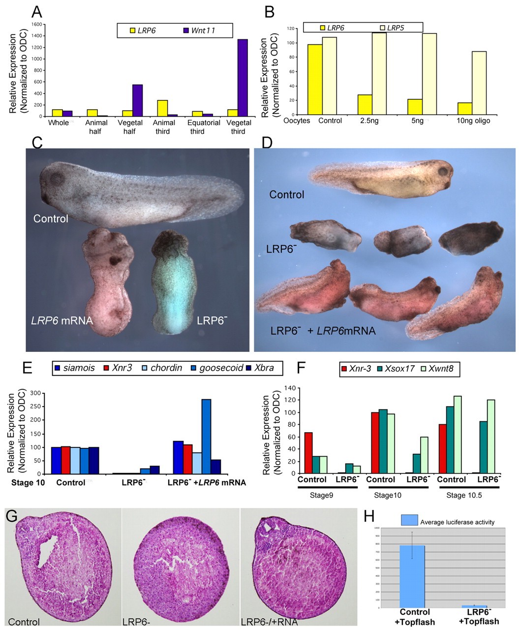 Fig. 1. LRP6 is necessary for dorsal axis formation. (A) Two wild-type whole oocytes, and four animal and vegetal halves, or six animal, equatorial and vegetal thirds, were frozen and assayed by real-time RT-PCR for the expression of LRP6 and Wnt11 mRNAs. LRP6 mRNA was expressed throughout the oocytes. (B) Groups of two control and LRP6 antisense oligo-injected oocytes (2.5, 5 and 10 ng oligo) were incubated for 24 hours, and assayed for the expression of LRP6 and the related LRP5 mRNA. LRP6, but not LRP5, mRNA levels were reduced by the antisense oligo. (C) The phenotype of tailbud-stage embryos derived from oocytes injected with 500 pg mouse LRP6 mRNA (dorsalized) or 5 ng LRP6 antisense oligo (LRP6-; ventralized). (D) The LRP6-depleted ventralized phenotype at tailbud stage caused by the injection of LRP6 antisense oligo (middle row; 3 ng antisense oligo injected) was rescued by the injection of 100 pg mouse LRP6 mRNA (bottom row). LRP6 mRNA was injected 48 hours after oligo injection and 24 hours before oocyte maturation. (E) The expression of Wnt target genes (siamois, Xnr3, chordin and goosecoid) assayed by real-time RT-PCR at the early gastrula stage in sibling embryos to those in D. (F) The expression of endoderm marker Xsox17α and ventral mesodermal marker Xwnt8 was delayed in LRP6-depleted embryos at the late blastula stage, but reached wild-type levels of expression by the early gastrula stage in LRP6-depleted embryos. By comparison, Xnr3 expression remained off in LRP6-depleted embryos. (G) Transverse sections of tailbud-stage embryos derived from a control, LRP6-depleted and LRP6- + LRP6-mRNA-injected oocytes. LRP6 depletion resulted in a lack of dorsal structures, which was rescued by LRP6-mRNA injection. (H) TOPflash reporter activation in control and LRP6-depleted late blastulae after injection into two dorsal cells at the 4-cell stage. Error bars indicate the standard deviation from the mean (s.e.m.).