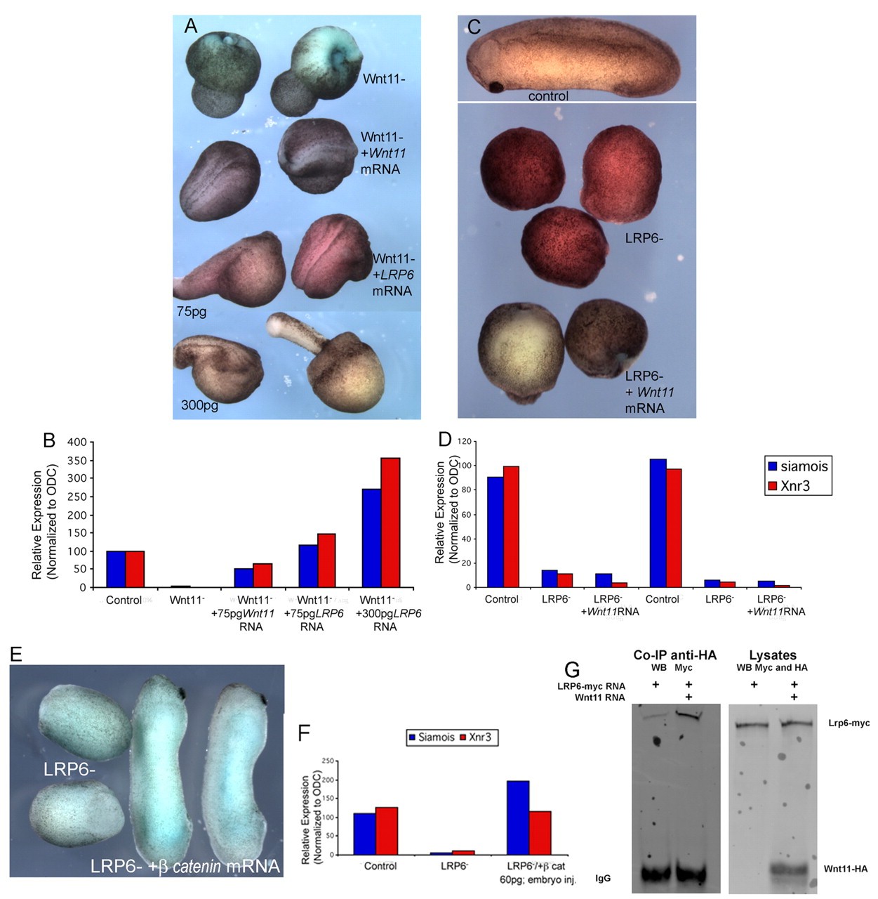 Fig. 3. LRP6 is downstream of Wnt11 and upstream of β-catenin in the axis-forming pathway. (A) The ventralized Wnt11-depletion phenotype at late neurula stage (top row; 9/9 cases ventralized), was rescued by 75 pg Wnt11 mRNA (second row; 0/8 cases ventralized), and by 75 pg LRP6 mRNA (third row; 0/12 cases ventralized), injected 24 hours before oocyte maturation. Additionally, 300 pg of LRP6 mRNA also rescued Wnt11-depleted embryos, but caused a dorsalized phenotype (fourth row; 0/8 cases ventralized). (B) The expression of Wnt target genes at the early gastrula stage (stage 10) in sibling embryos to those shown in A, assayed by real-time RT-PCR. LRP6 mRNA rescued the expression of siamois and Xnr3 in Wnt11-depleted embryos. (C) The ventralized LRP6-depletion phenotype at tailbud stage (red embryos; 9/9 cases ventralized) was not rescued by the injection of 100 pg Wnt11 mRNA 24 hours prior to maturation (bottom row; 6/6 cases ventralized). (D) The expression of Wnt target genes at the late blastula stage (stage 9.5) and early gastrula stages (stage 10) in embryos that were siblings to those shown in C, assayed by real-time RT-PCR. Wnt11 was not able to rescue the expression of Wnt target genes in LRP6-depleted embryos. (E) The ventralized LRP6-depletion phenotype (7/7 cases ventralized) shown at tailbud stage was rescued by the injection of 50 pg β-catenin mRNA into one dorsal cell at the 4-cell stage (6/20 cases ventralized). (F) The expression of Wnt target genes at the early gastrula stages (stage 10) in embryos that were siblings to those shown in C, assayed by real-time RT-PCR. β-catenin rescued the expression of Wnt target genes in LRP6-depleted embryos. (G) Lrp6-N-Myc interacts with Wnt11-HA in co-immunoprecipitation assays. Lrp6-N-Myc (1.5 ng) and Wnt11-HA (500 pg) were injected into two different blastomeres at the 4- to 8-cell stage. Embryos were harvested at stage 10.5. Panel on the right is a western blot of the embryo lysates, blotted with both anti-myc and anti-HA antibody. Panel on the left shows the result of the lysates immunoprecipitated with anti-HA antibody and blotted with anti-myc antibody. IgG band is indicated on the bottom of the left panel.