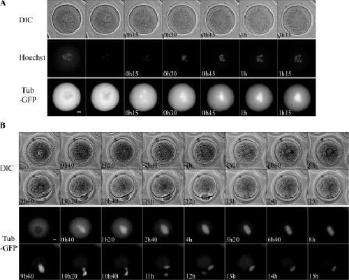 Figure 1. Spindle formation during mouse meiotic maturation. (A) Time-lapse microscopy of phase contrast (DIC), Hoechst-stained chromosomes (Hoechst), and tubulin-GFP RNA-injected (Tub-GFP) oocytes. Images were taken every 15 min. (B) Time-lapse microscopy of phase contrast (DIC) and tubulin-GFP RNA-injected (Tub-GFP) oocytes. Images were taken every 20 min. Times after GVBD are indicated in the bottom left corner. n = 33. Bars, 10 μm.