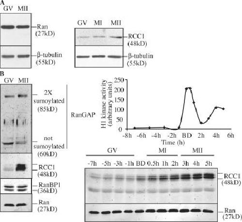 Figure 2. Characterization of Ran and its regulators in mouse and X. laevis oocytes. (A, left) The amount of Ran protein is stable during meiotic maturation of mouse oocytes. 30 immature (GV) or mature (MII) mouse oocytes were collected and immunoblotted using a monoclonal anti- Ran antibody and an anti-tubulin antibody. (right) The amount of RCC1 increases slightly during meiotic maturation of mouse oocytes. 100 immature (GV), 4 h after GVBD (MI), or mature (MII) mouse oocytes were collected and immunoblotted using a polyclonal anti-RCC1 antibody and an anti-tubulin antibody. (B, left) RCC1 levels increase during meiosis in X. laevis oocytes, but RanGAP, RanBP1, and Ran levels remain constant. Oocyte lysates (GV) or egg lysates (MII) were immunoblotted using anti-RanGAP, anti-RCC1, anti-RanBP1, and anti-Ran antibodies. (top right) Histone H1 kinase activity (arbitrary units) during meiotic maturation induced by progesterone. (bottom right) Increase of RCC1 amount during meiosis resumption in X. laevis. Two oocytes were used for each time point.