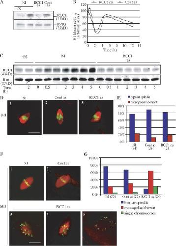 Figure 7. Down-regulation of RCC1 during meiotic maturation in X. laevis oocytes does not compromise meiosis I spindle formation but affects the meiosis II spindle. (A) Western blot on oocyte lysates using antibodies against RCC1 or PP1G as loading control, before (−pg) and 12 h after induction of maturation with progesterone in nontreated (NI), control injected (Cont as), or RCC1 knockdown (RCC1 as) samples. (B) Histone H1 kinase activities were measured with time after GVBD in control injected (triangles) and RCC1 knockdown (circles) oocytes. (C) Western blot on oocyte lysates using antibodies against RCC1 and Ran as loading control, before and after induction of maturation with progesterone in nontreated controls or antisense RCC1-injected oocytes. Samples were taken before progesterone addition or after GVBD (GVBD corresponds to time 0). (D–G) Representative images (D and F) and quantitative analysis of imaged structures (E and G) of spindles visualized in MI (D and E; 1.5 h after GVBD) or MII (F and G; 12 h after GVBD) by indirect immunofluorescence with antibodies against α-tubulin (red) or Cytox green (green) of oocytes treated as in (A, B, and C). Bars, 20 μm.