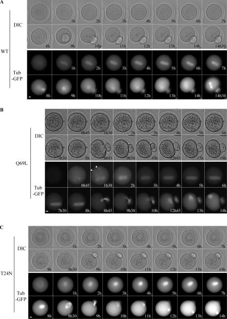 Figure 4. Excess or reduced levels of RanGTP induce spindle defects during meiosis I and II of mouse oocytes. Time-lapse microscopy of phase contrast (DIC) and tubulin-GFP (Tub-GFP) of oocytes injected with tubulin-GFP together with RanWT (A) or RanQ69L (B) or RanT24N (C) RNA. Images were taken every 15 min. Arrowheads indicate asters. Times after GVBD are indicated in the bottom right corner. n = 34 (RanWT), 26 (RanQ69L), and 75 (RanT24N). Bars, 10 μm.