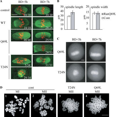 Figure 5. MI spindle defects induced by excess or reduced levels of RanGTP do not compromise homologous chromosome segregation. (A and B) RanQ69L-injected oocytes assemble longer spindles with poles defects, whereas RanT24N induces a lack of MT assembly associated with a delay in spindle formation. (A) Immature oocytes were microinjected with RanWT, RanQ69, or RanT24N, collected 5 or 7 h after GVBD and immunostained for MTs (green) and DNA (red). Oocytes were analyzed by confocal microscopy, and all confocal sections were projected. Proportions of each phenotype are indicated in the bottom right corner. (B) Statistics of spindle length and width in control and RanQ69L-injected oocytes. Error bars indicate SD. (C) Still images taken from time-lapse microscopy of tubulin-GFP (Tub-GFP) of oocytes injected with tubulin-GFP together with RanQ69L or RanT24N RNA. (D) Meiosis I spindles assembled with modified RanGTP levels can segregate homologous chromosomes. Noninjected control oocytes were collected 6 h (MI) or 12 h (MII) after GVBD and submitted to chromosome spread preparation. MI preparation shows only bivalent chromosomes with chiasmata, whereas MII preparation shows only univalent chromosomes (1 and 2). RanT24N- or RanQ69L-injected oocytes were collected 12 h after GVBD (MII) and similarly submitted to chromosome spread preparation (3 and 4). In both cases, only univalent chromosomes are seen. 25 oocytes were analyzed for each condition. Bars, 10 μm.