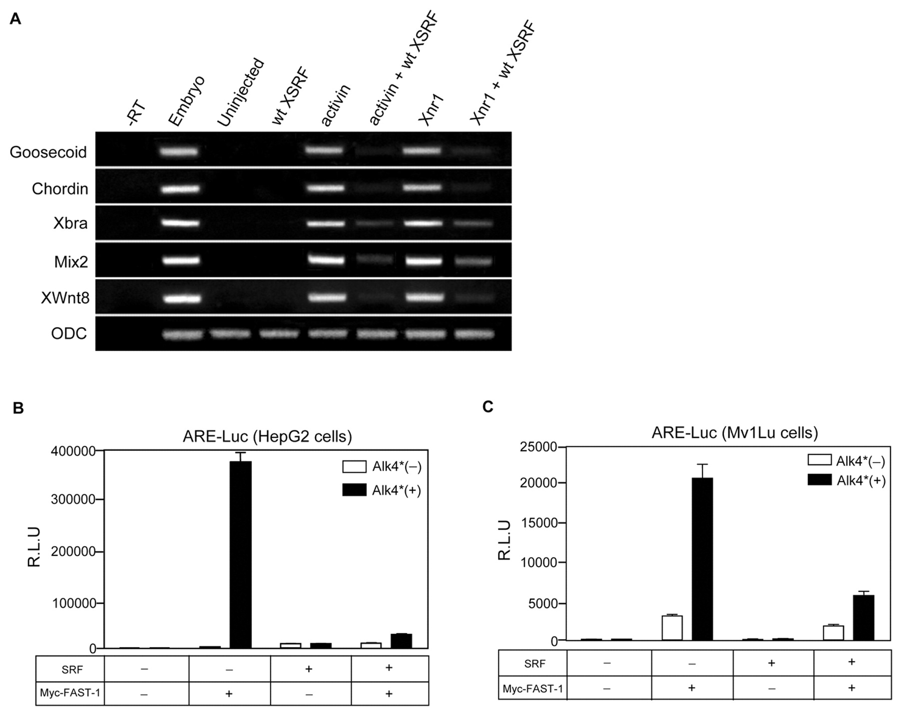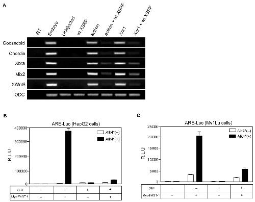 SRF inhibits Activin/Nodal signaling. (A) Wild-type XSRF inhibited the induction of mesendoderm markers by Activin or Xnr1 in animal caps. Embryos were injected at the four-cell stage in the animal pole region with wt XSRF mRNA (2 ng) with or without Xnr1 mRNA (50 pg), and then the animal caps isolated at stage 8.5 were cultured in the presence of Activin protein (10 ng/ml, for animal caps without Xnr1 injection) until stage 10.25 and then subjected to RTPCR analysis. ODC, ornithine decarboxylase as a loading control; -RT, a control of RT-PCR on stage 10.25 whole embryo in the absence of reverse transcriptase; Uninjected, uninjected control. (B) HepG2 and (C) Mv1Lu cells were transiently transfected with a control vector or SRF along with ARE-Luc and FAST-1. Cells were harvested 36 hours after transfection for luciferase assays. β-Galactosidase activities were used to normalize for transfection efficiency. All luciferase asssays were performed in triplicate. |