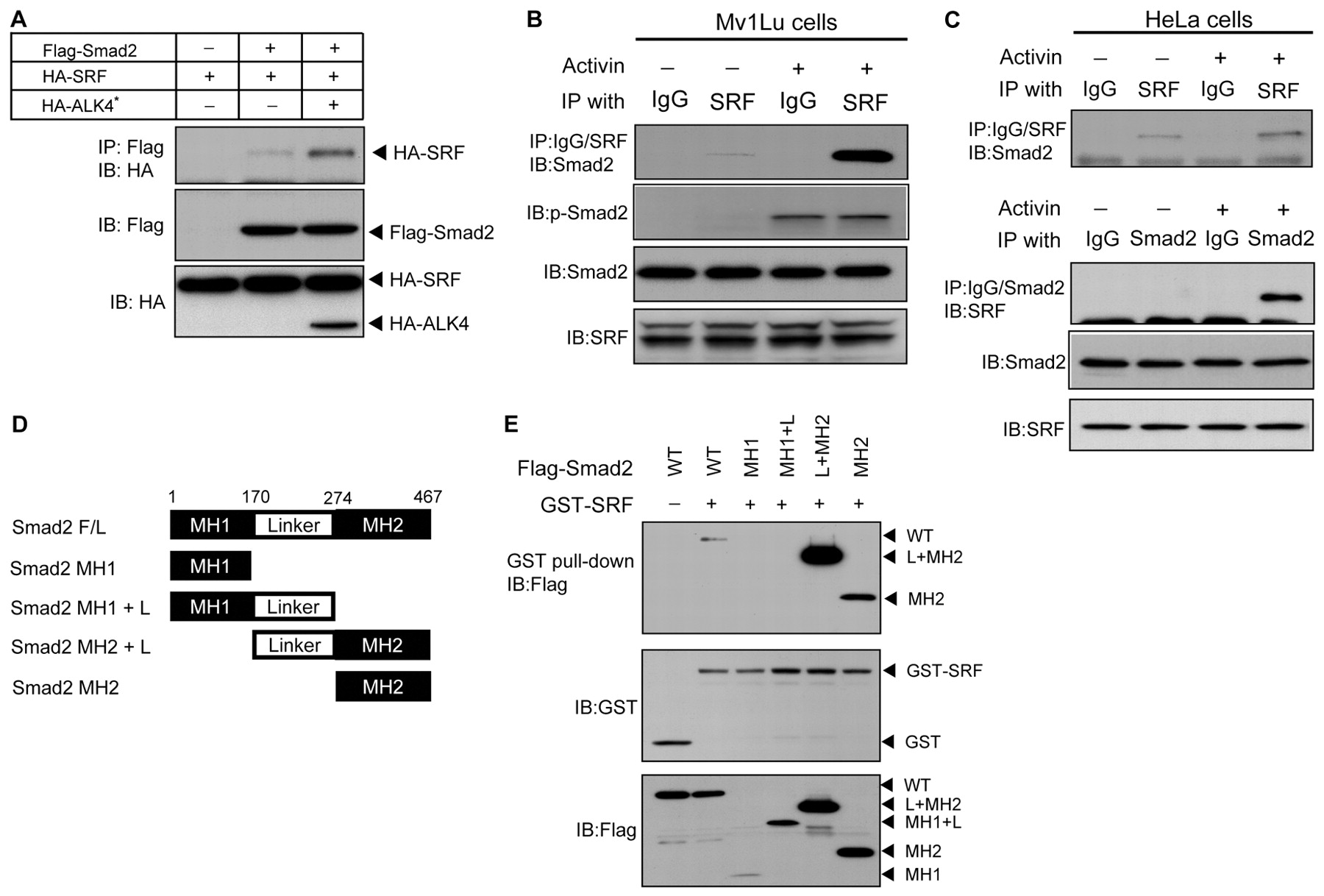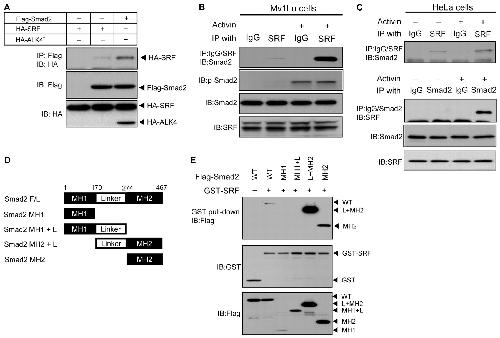 SRF interacts with Smad2. (A) 293T cells were transfected with HA-tagged SRF and Flag-tagged Smad2 with or without constitutively active Activin type-I receptor (ALK4*). Cell lysates were immunoprecipitated (IP) with anti-Flag antibody, followed by immunoblotting (IB) with anti-HA antibody to detect Smad-bound SRF. (B,C) Interaction of endogenous SRF and Smad2 was examined in Mv1Lu and HeLa cells. (B) Mv1Lu cells were left untreated or treated with Activin A for 1 hour. Cell lysates were subjected to IP with anti-SRF rabbit polyclonal antibody, followed by IB with an anti-Smad2 mouse monoclonal antibody. (C) HeLa cell lysates were subjected to IP with anti-SRF antibody, followed by IB with anti-Smad2 antibody. This was repeated in reverse order. (D) Schematic of Smad2 truncation mutants. (E) Flag-tagged Smad2 deletion mutants were transfected into 293T cells together with GST-SRF. Cell lysates were pulled down by glutathione-agarose beads and then immunoblotted with antiFlag antibody. |