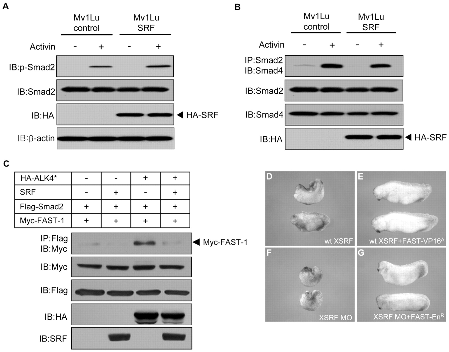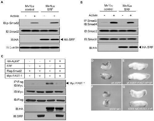 SRF inhibits Activin-induced formation of FAST-1-Smad2 complex. (A) Stable Mv1Lu cells expressing exogenous SRF and control cells were incubated in the presence or absence of 25 ng/ml Activin A for 1 hour. Smad2 phosphorylation was analyzed by immunoblotting with antiphospho-Smad2 antibody. Expression of Smad2 and SRF was monitored by immunoblotting with anti-Smad2 and anti-HA antibodies. (B) Stable Mv1Lu cells expressing exogenous SRF and control cells were treated as in A. Cell lysates were immunoprecipitated with anti-Smad2 antibody and then immunoblotted with anti-Smad4 antibody. Expression of Smads and SRF was monitored by immunoblotting with anti-Smad2, anti-Smad4 and anti-HA antibodies. (C) 293T cells were co-transfected with the indicated constructs and harvested 36 hours after transfection. Cell lysates were immunoprecipitated with anti-Flag antibody and then immunoblotted with anti-Myc antibody. Expression of Flag-Smad2, Myc-FAST-1, HA-ALK4* and SRF was monitored as indicated. (D-G) Rescue by FAST-1 mutants of the axial defects caused by gain- or loss-of-function of XSRF. Four-cell stage embryos were injected dorsally with a combination of the indicated reagents (2 ng wt XSRF; 20 pg FAST-VP16A; 60 ng XSRF MO; 2 pg FAST-EnR) and cultured to stage 31. |