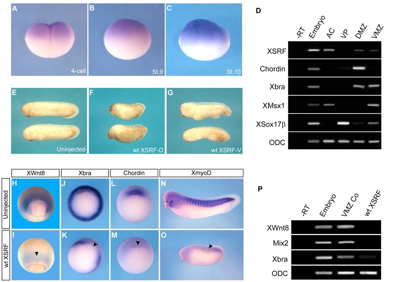 Fig. 1. Misexpression of XSRF suppresses mesodermal cell fates. (A-C) Spatial expression of XSRF at the four-cell, blastula and early gastrula stages. Lateral views are shown. (D) XSRF expression in dissected gastrula embryos. Animal cap (AC), vegetal pole (VP), dorsal marginal zone (DMZ) and ventral marginal zone (VMZ) explants were dissected from stage 10.5 gastrula embryos and subjected to RT-PCR analysis. -RT, control RT-PCR in the absence of reverse transcriptase. The following controls were included as markers for the dissected tissues: Chordin for dorsal mesoderm, Xbra for pan-mesoderm, XMsx1 for animal cap and ventral mesoderm and XSox17β for endoderm. ODC, ornithine decarboxylase loading control. (E-G) Phenotypic effects of overexpression of wild-type (wt) XSRF RNA. Four-cell stage embryos were injected in the dorsal (F) or ventral (G) marginal regions with wt XSRF mRNA (2 ng), or not injected as a control (E), and cultured until sibling embryos reached stage 30. Lateral views are shown and anterior is to the left. (H-P) Ectopic wt XSRF interferes with the expression of mesodermal genes. Four-cell stage embryos were injected in the dorsal or ventral marginal regions with wt XSRF mRNA (2 ng) and, along with uninjected controls, cultured to stage 10.25-10.5 (H-M,P) and 28 (N,O) and then analyzed by whole-mount in situ hybridization using antisense Xenopus Wnt8 (H,I), brachyury (J,K), chordin (L,M) and myoD (N,O) probes or RT-PCR (P). Arrowheads in I,K,M,O indicate the absence or reduction of expression of genes. (H,I) Ventro-vegetal views are shown. (J-M) Vegetal views are shown with dorsal side at top. (N,O) Lateral views are shown with anterior side to the left. (P) Ventral marginal zone explants were dissected at stage 10.25 and subjected to RT-PCR. VMZ Co, uninjected ventral marginal zone tissue. |