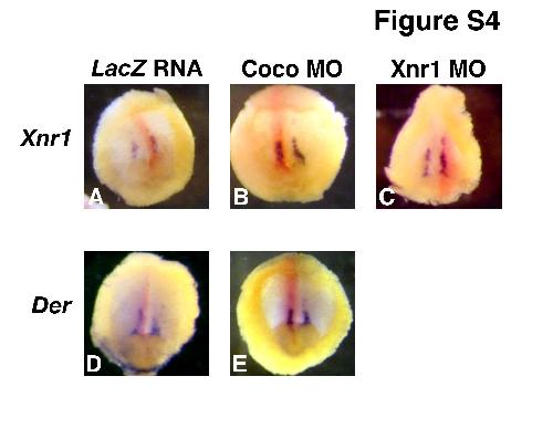 Supplementary Fig. S4. Coco and Xnr1 MOs do not affect expression of posterior paraxial genes. Double in situ hybridization for the indicated markers (purple) and LacZ (red). Coco MO (3 ng, right dorsal side) and Xnr1 MO (2 ng, left dorsal side) were coinjected with LacZ RNA (1 ng) in the C2 blastomere (32 cell stage), and embryos were collected at stage 18. Inner side of dissected posterior poles is shown, dorsal side up. A-C Xnr1 in situ. D, E derrie in situ. A, D LacZ RNA injections. B, E Coco MO+LacZ RNA. C Xnr1 MO+LacZ RNA.. |