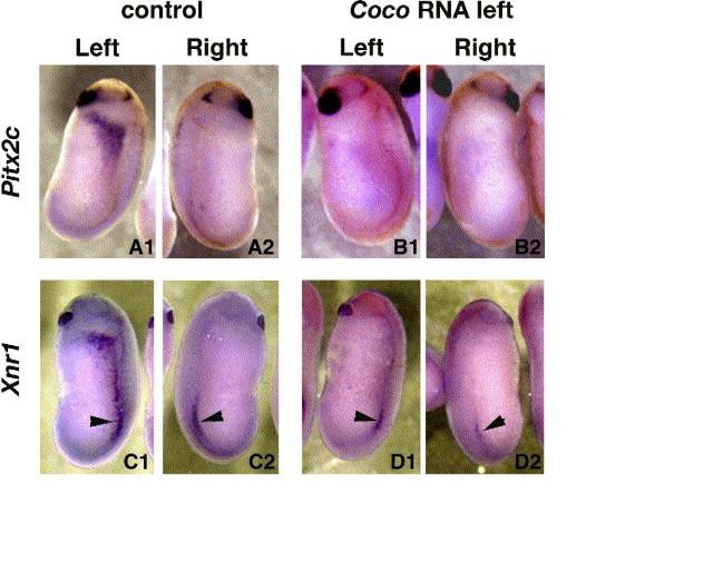 Coco RNA prevents expression of left side markers. Embryos were injected on the left dorsal side of four-cell stage embryos with Coco RNA (10 pg) and collected at stage 24. In situ hybridization for Pitx2c (A, B) and Xnr1 (C, D). Left and right sides of the same embryos are shown. Arrowheads in panels C and D indicate the posterior, bilateral expression domain of Xnr1, not affected by Coco RNA. |