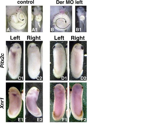 Depletion of Der protein on the left side randomizes the leftight axis. Embryos were injected at the four-cell stage with 2 ng Der MO in the dorsal left blastomere, and collected at stage 46 for phenotype, or 25 for marker expression. (A, B) Stage 46 embryos, ventral view. (A) Control, (B) Xnr1 MO injected (Situs inversus). Panels A1 and B1 show the normal head and trunk of the same embryos. The contour of the hearts is indicated, and arrows show the direction of the outflow tract of the heart and of gut looping. (C) Effect of Der MO on expression of Pitx2c (C, D) and Xnr1 (E, F). Left and right sides of the same embryos are shown. Embryos injected with Der MO are devoid of Xnr1 and Pitx2c expression in the anterior left LPM (D, F). |