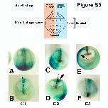 Supplementary Fig. S3. Cell fate of tier C blastomeres from 32 cell stage embryos, at stage 18. 32 cell stage embryos (upper panel, nomenclature of Nakamura, descendents of the dorsal blastomere from 4 cell stage in light blue, and of the ventral blastomere in pink) were injected in blastomeres C1, C2 (dorsal descendents) and C3 (ventral descendent) with 2 ng LacZ RNA, collected at stage 18, and stained with X-Gal (blue dots). All embryos are cleared. A, B. C1 injection. A: dorsal view. B: sectioned posterior half, internal view. Most of the tracer migrates to the anterior pole, the rest is mostly axial, with some contribution to posterior paraxial mesoderm. C, D. C2 injection. C: anterior half, external view. D: posterior half, internal view. Arrow in D indicates tracer in ventral paraxial mesoderm. E, F. C3 injection. E: anterior half, internal view. Arrow indicates lateral plate mesoderm. F: posterior half, external view. Tracer is lateral to the posterior paraxial mesoderm. Bars in B and D indicate the midline. |