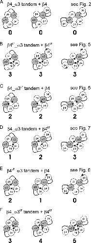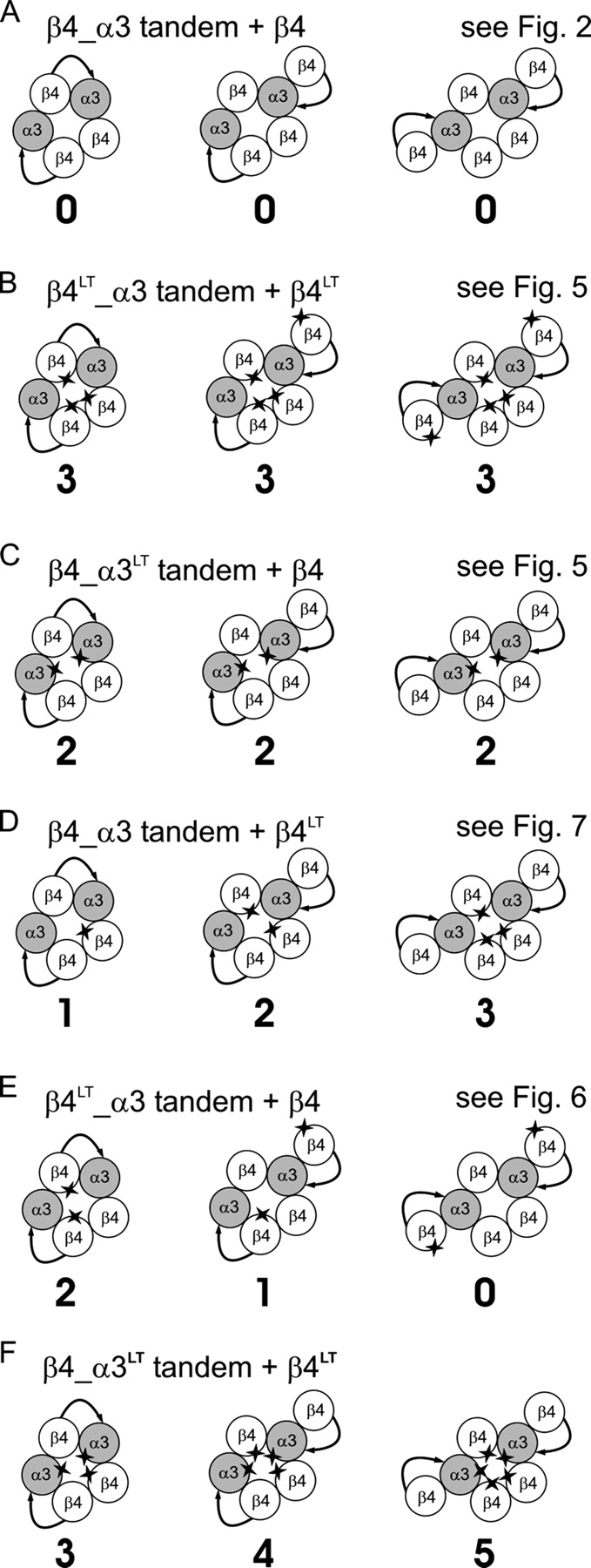 Figure 1. . Diagrammatic representation of different nAChR assemblies which may be formed by complete (left) or partial (center and right) incorporation of linked constructs into the receptor. B–F show the effects of introducing a reporter mutation (a Thr in the 9′ position of the second transmembrane domain) in different subunits; references are given to the figures that show the results with each combination. The number under each cartoon shows the number of mutation copies expected to be in the gate for each receptor assembly. Note that no heterogeneity in the number of mutation copies is predicted if all α, all β, or no subunits are mutated (A–C) in accord with the experiments in Figs. 2 and 5. Mutating β only in the monomer construct or only in the tandem construct (D and E) can detect the different receptor forms (see the experiments in Figs. 7 and 6, respectively). If receptors are expressed in which both α and βmonomer (F) bear the mutation, some receptors will bear five copies of the mutation (see results).