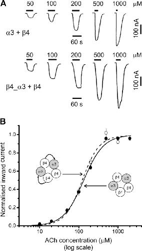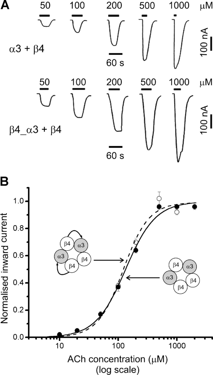 Figure 2. . ACh concentration-response curves of α3β4 nAChR expressed in oocytes from monomer or tandem constructs are indistinguishable. (A) Traces are inward currents recorded at a holding potential of −70 mV in response to bath-applied ACh. (B) ACh concentration-response curves from experiments such as the ones shown in A, performed in oocytes injected with either α3 and β4 monomer cRNAs (filled circles, n = 9) or β4_α3 tandem together with β4 monomer cRNAs (open circles, n = 4). Full sets of peak responses to ACh from each oocyte were fitted with the Hill equation and normalised to the fitted maximum response before pooling (see materials and methods). The curves shown are the results of fitting the pooled data.